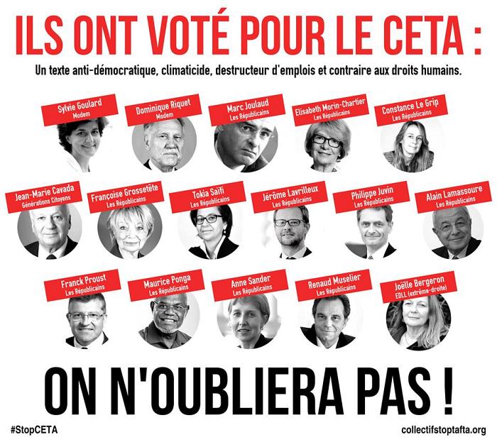 Ci-dessous, les euro-député.e.s identifié.e.s « Anti CETA » ont voté contre ; les « indéterminé.e.s » se sont abstenu.e.s ou étaient absent.e.s ; les « Pro CETA » ont voté pour.