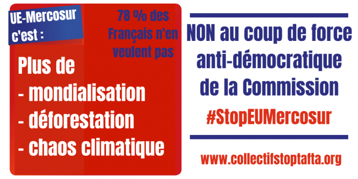 Tour de passe-passe antidémocratique. Une nouvelle analyse juridique (ici en .pdf) commandée par la coalition européenne StopEUMercosur, dont l’Aitec et le collectif national Stop CETA-MERCOSUR, montre que les velléités de la Commission européenne visant à modifier les règles du jeu de la ratification de l’accord UE-Mercosur en vue de contourner l’opposition de certains États et parlements nationaux violent son mandat. Nos organisations appellent donc les gouvernements et les décideurs européens à rejeter avec fermeté toute tentative de la Commission visant à accélérer la ratification de la partie commerciale de l’accord d’association UE-Mercosur.