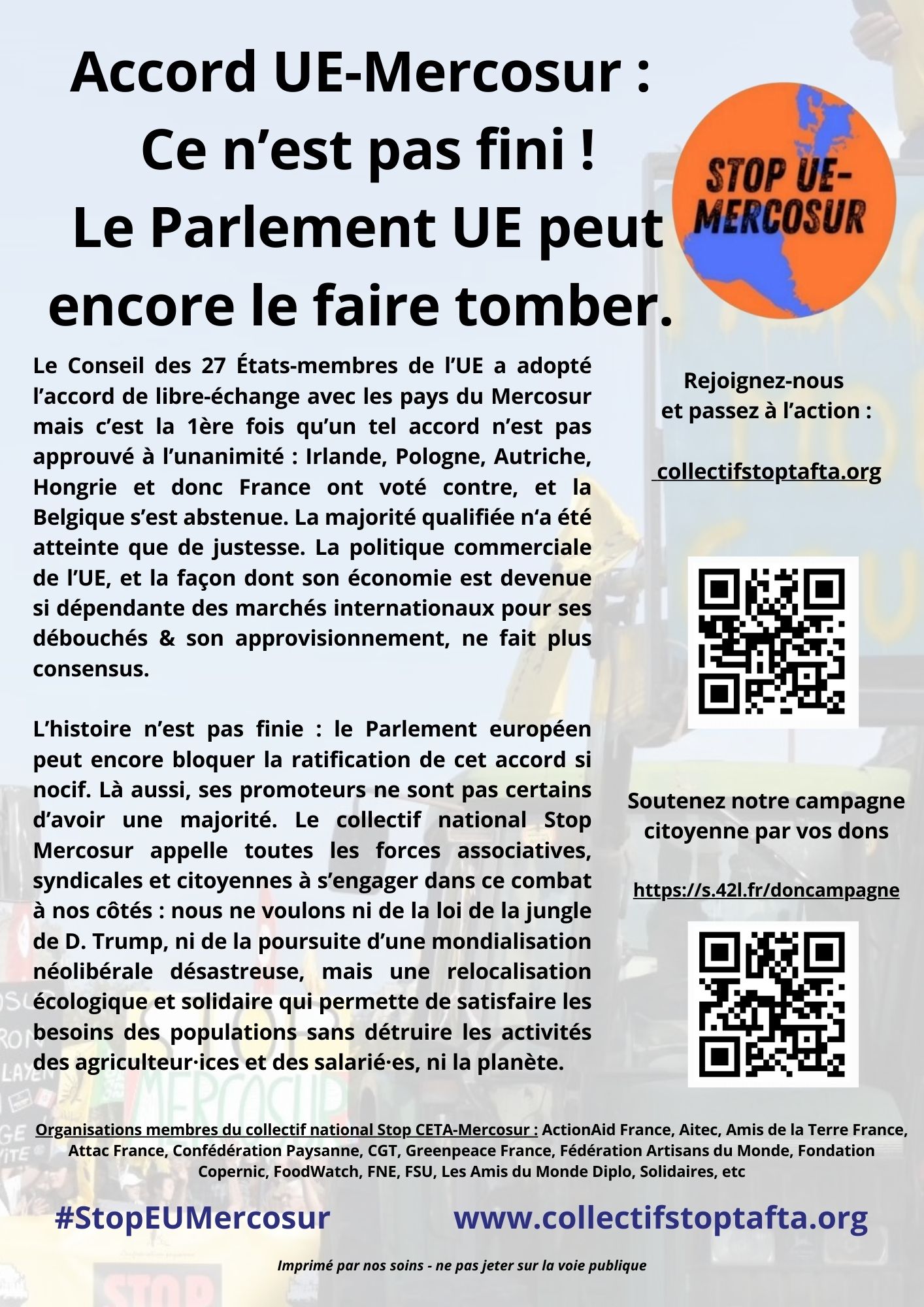 - décembre 2024, 400 organisations de la société civile des deux côtés de l’Atlantique appellent à l’abandon de cet accord nocif.