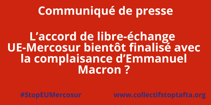 « dénonce des négociations qui se déroulent en toute opacité et alors que l’opinion publique française pense que cet accord a été stoppé par Emmanuel Macron au moment de la mobilisation du monde agricole ».