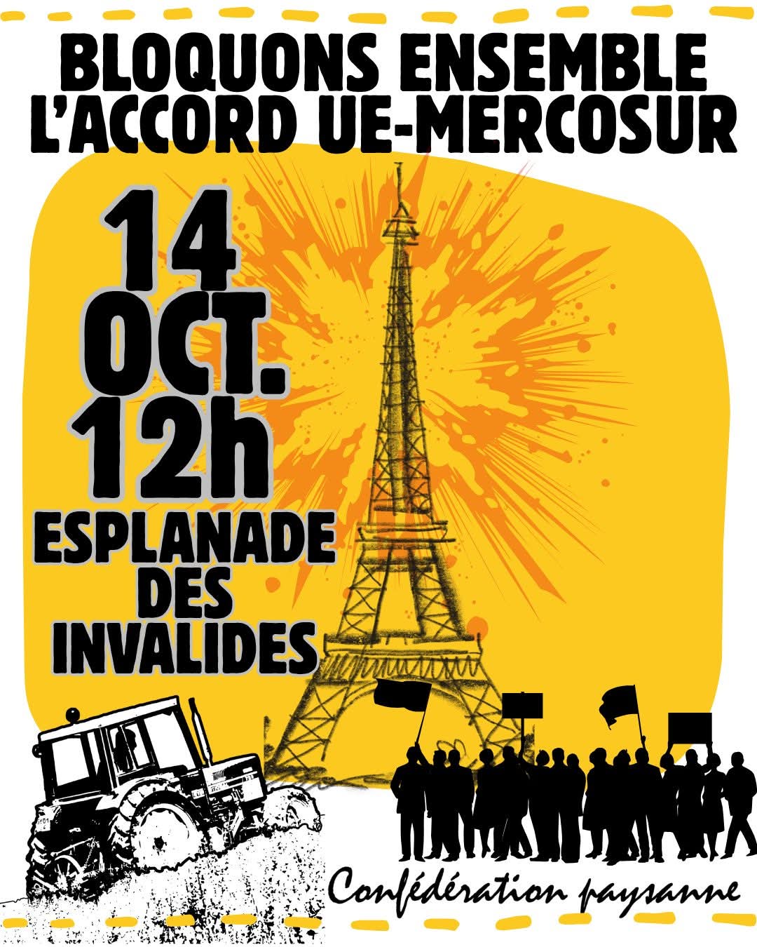 Nous, paysan.nes, syndicalistes, responsables d’organisations de solidarité internationale et de protection de l’environnement, scientifiques, artistes, citoyen.nes, appelons à une mobilisation massive paysanne et citoyenne sur Paris le 14 octobre, à 12h esplanade des Invalides, pour exiger la régulation des marchés internationaux et dénoncer la logique du libre-échange qui délocalise nos productions et tire vers le bas les normes sociales et environnementales.