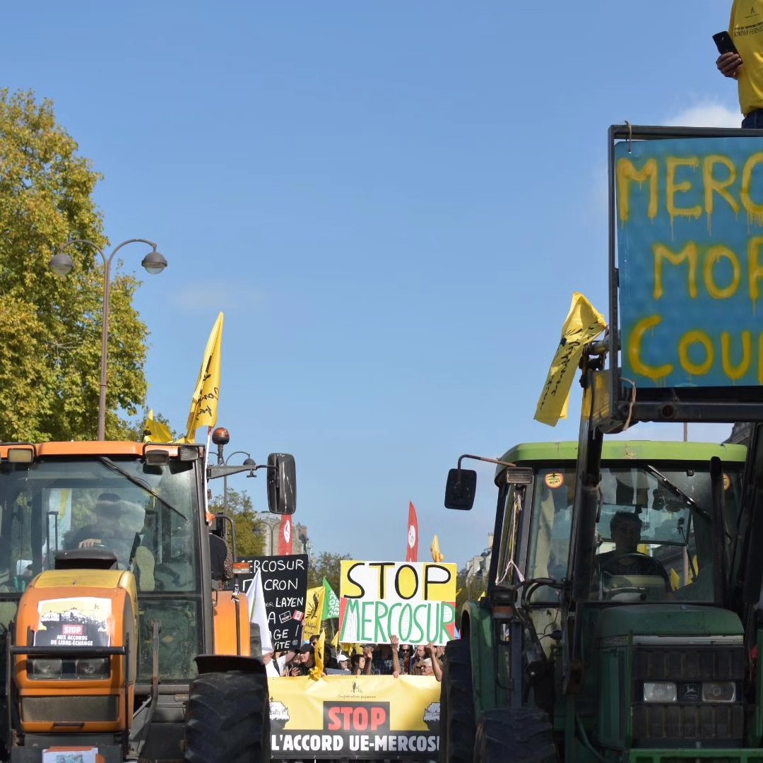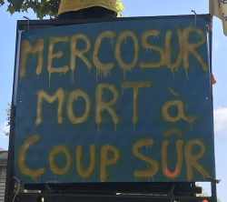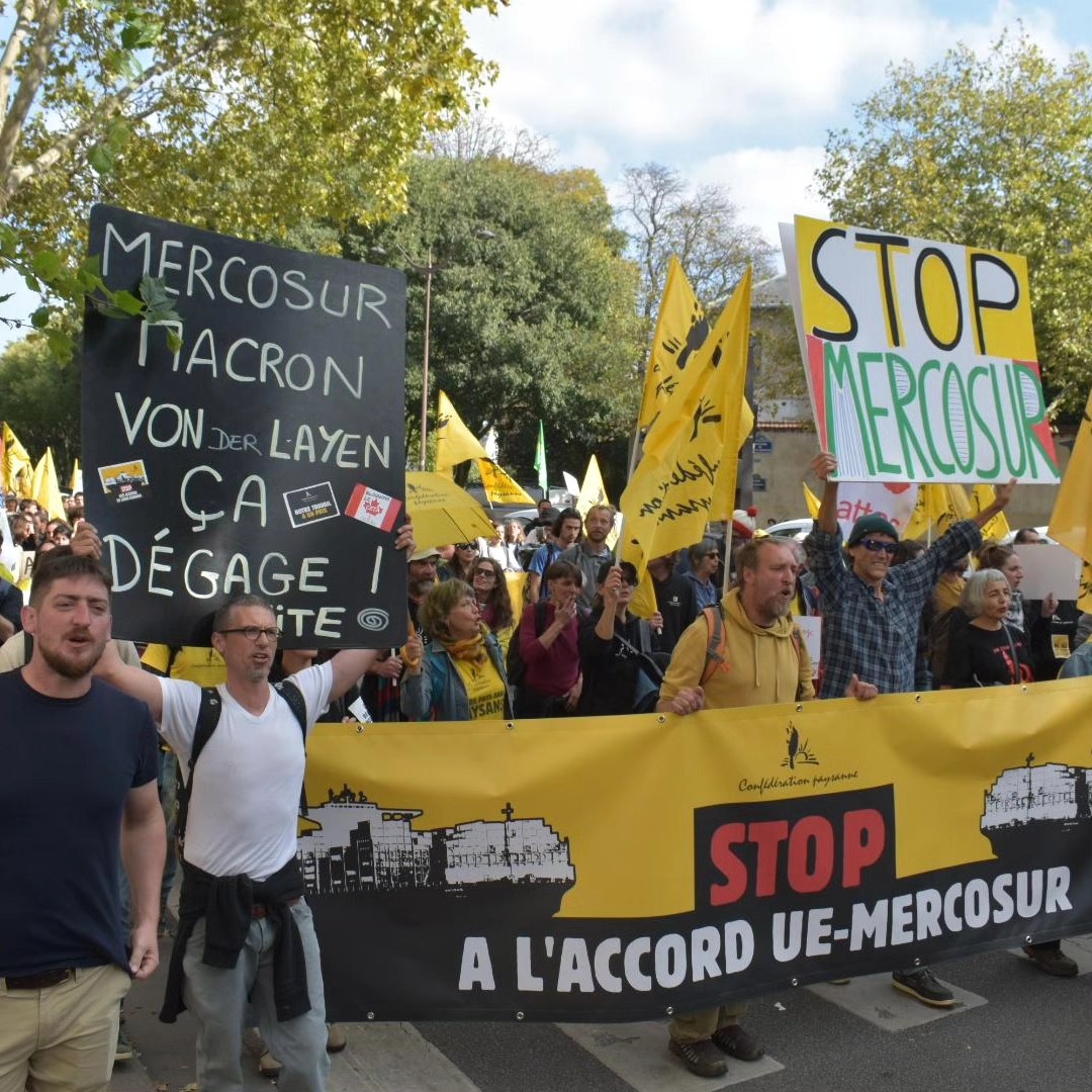 Sous un généreux soleil d’automne, une manifestation dynamique et déterminée a de nouveau interpellé Emmanuel Macron : alors que le contenu de l’accord n’a pas été modifié d’un millimètre, pourquoi la position de la France a-t-elle changé ? Cet accord, le plus nocif jamais négocié par l’Union européenne depuis des années, est et restera inacceptable.