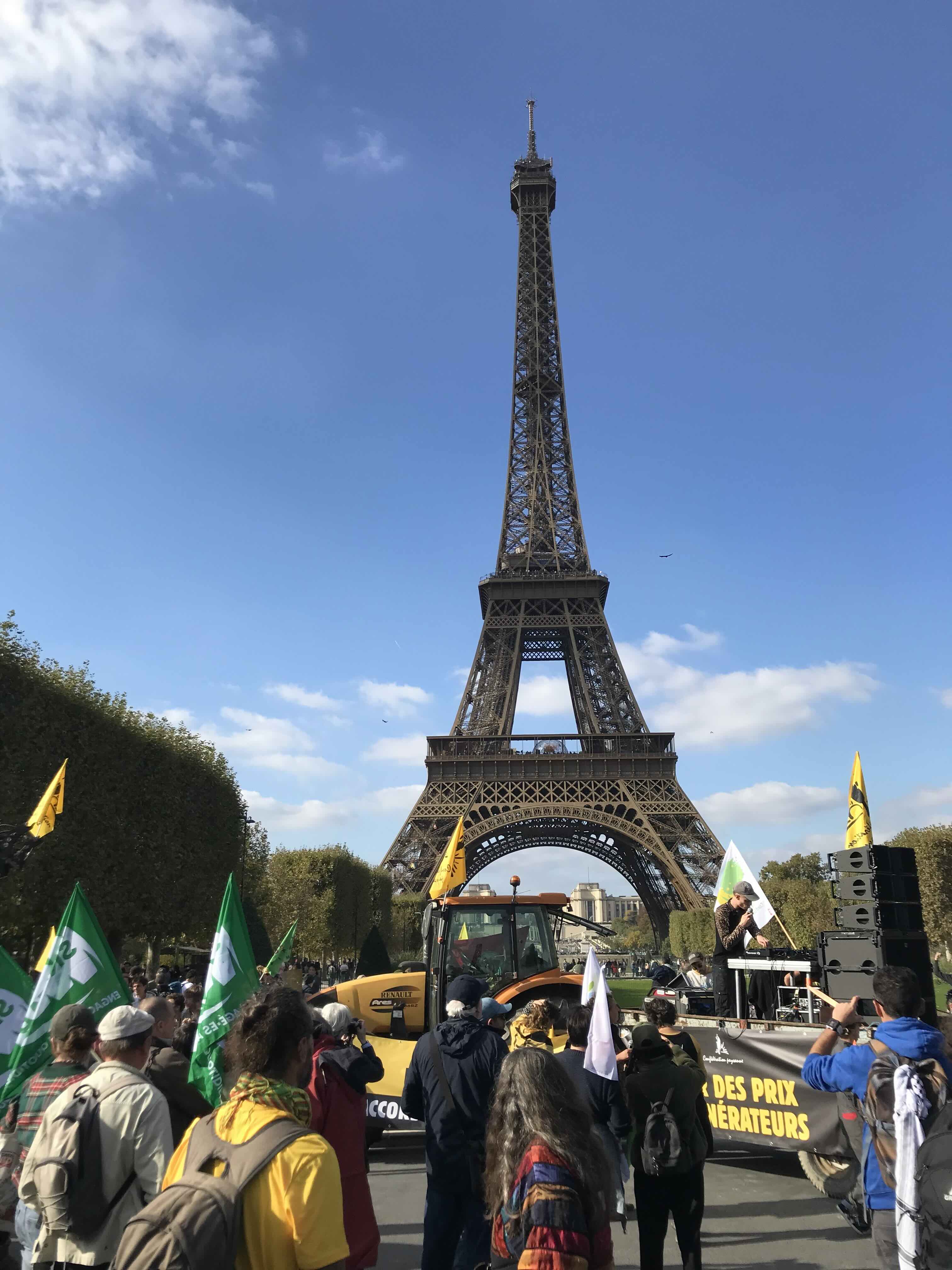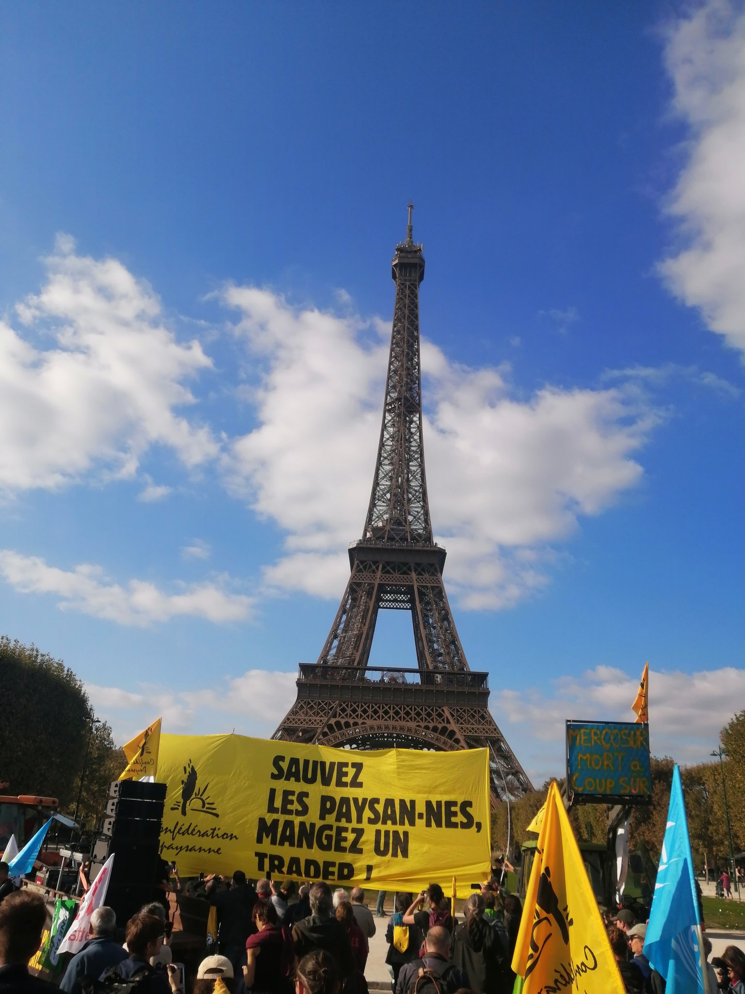 A l’appel de la Confédération paysanne, rejointe par une cinquantaine d’organisations de la société civile (syndicats, associations, ONG, collectifs etc), plusieurs tracteurs et un millier de personnes ont manifesté des Invalides au Champ-de-mars, au pied de la Tour Eiffel pour dire, une nouvelle fois : « Pour nous, l’accord de libre-échange UE-Mercosur, c’est NON ».