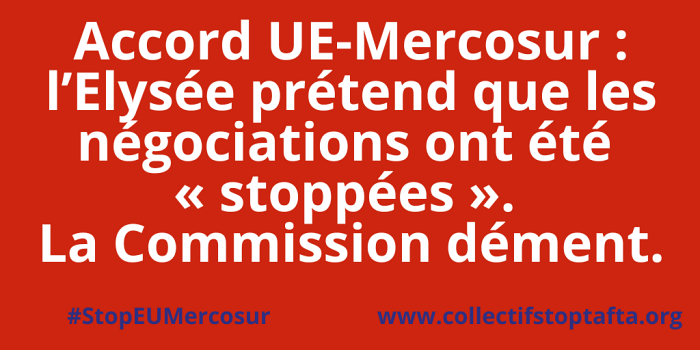 Pour Maxime Combes, économiste à l’Aitec, « cette annonce de l’Elysée démentie par la Commission européenne jette de l’huile sur le feu et illustre les limites d’un exécutif qui communique plus qu’il n’agit : cet accord UE-Mercosur n’est pas une fatalité et la France peut, et doit, intervenir au niveau du Conseil pour dénoncer le mandat de négociation dont dispose la Commission européenne, qui date de 1999 et qui est totalement anachronique ».