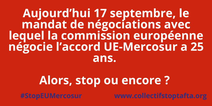 En cette journée anniversaire des 25 ans du mandat de négociations avec lequel la commission européenne négocie l’accord UE-Mercosur, qui ne mentionne ni le climat ni la biodiversité ni la préservation des emplois, et qui n’aurait jamais été rendu public sans l’action de la société civile, il est urgent d’obtenir des clarifications.