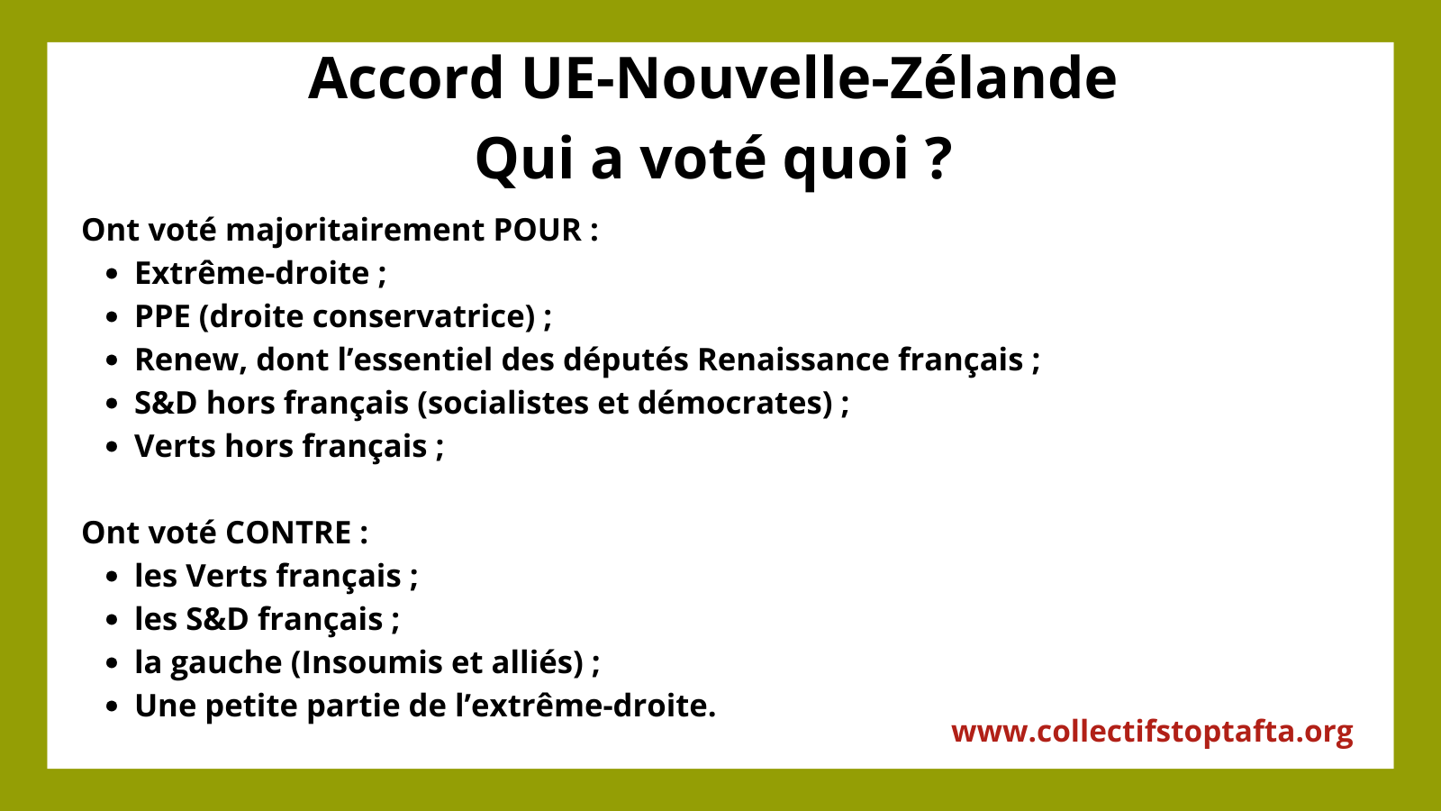C’est avec consternation que nous constatons que 83% des députés européens (524 sur 630 votants) ont approuvé la ratification de l’accord de libéralisation du commerce UE-Nouvelle-Zélande alors que cet accord va aggraver la crise climatique et fragiliser la situation de l’agriculture paysanne européenne. La campagne d’interpellation menée par les organisations de la société civile n’a pas été vaine : les eurodéputés Français des groupes S&D, Verts et GUE ont voté contre cet accord, contrairement aux eurodéputés Renew (Renaissance) qui ont voté pour cet accord. La France peut encore s’y opposer lors du prochain Conseil des ministres du commerce du 27 novembre, sans quoi cet accord sera définitivement ratifié et mis en œuvre.