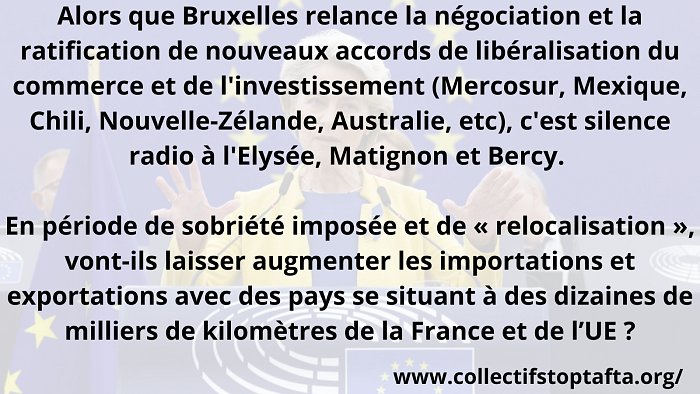 1) Question générale : En période de sobriété imposée et d’efforts entrepris en faveur de la « relocalisation », quelle est la position de la France face aux velléités de la Commission européenne de vouloir rapidement « ratifier les accords de commerce avec le Chili, le Mexique et la Nouvelle-Zélande » et « poursuivre les négociations avec l’Australie et l’Inde », tout en cherchant à ressusciter l’accord UE-Mercosur ? Alors qu’il est désormais largement acquis qu’il est nécessaire de réduire immédiatement et massivement et nos émissions de gaz à effet de serre, est-il vraiment raisonnable de vouloir augmenter les importations et exportations avec des pays se situant à des dizaines de milliers de kilomètres de la France et de l’Union européenne ?