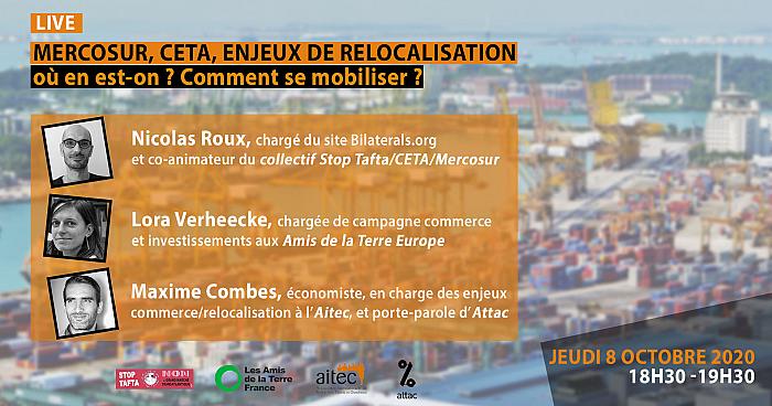 Où sont donc passées les promesses de relocalisation ? A Bruxelles, la Commission négocie de nouveaux accords de libéralisation du commerce tous azimuts, tandis qu’Emmanuel Macron dit à Paris s’opposer à l’accord UE-Mercosur mais ne prend aucune initiative pour le bloquer, tout en entérinant le CETA, tout aussi décrié. Le jeudi 8 octobre, à 18h30, l’Aitec, Attac France, les Amis de la Terre, avec le soutien du collectif Stop TAFTA-CETA-Mercosur ont organisé ce jeudi 8 octobre un webinaire pour faire un état des lieux sur tous ces sujets afin d’amplifier la pression.