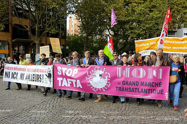 La mobilisation contre le TAFTA prend de l’ampleur et gagne la rue ! Samedi 11 octobre, des dizaines des milliers de citoyens ont organisé plus de 1000 initiatives et de larges manifestations dans 22 capitales européennes pour dénoncer les traités des multinationales et scander « Stop TAFTA, CETA et TiSA ! ». Plus de 70 rassemblements ont eu lieu partout en France, de Brest à Aix en Provence en passant par Lille, Lyon, Narbonne ou Toulouse. La manif’action parisienne a réuni plusieurs milliers de personnes et a convergé, place de la République, avec les mobilisation de la journée internationale contre les gaz de schistes et la manifestation « NON au salon pro-nucléaire ».