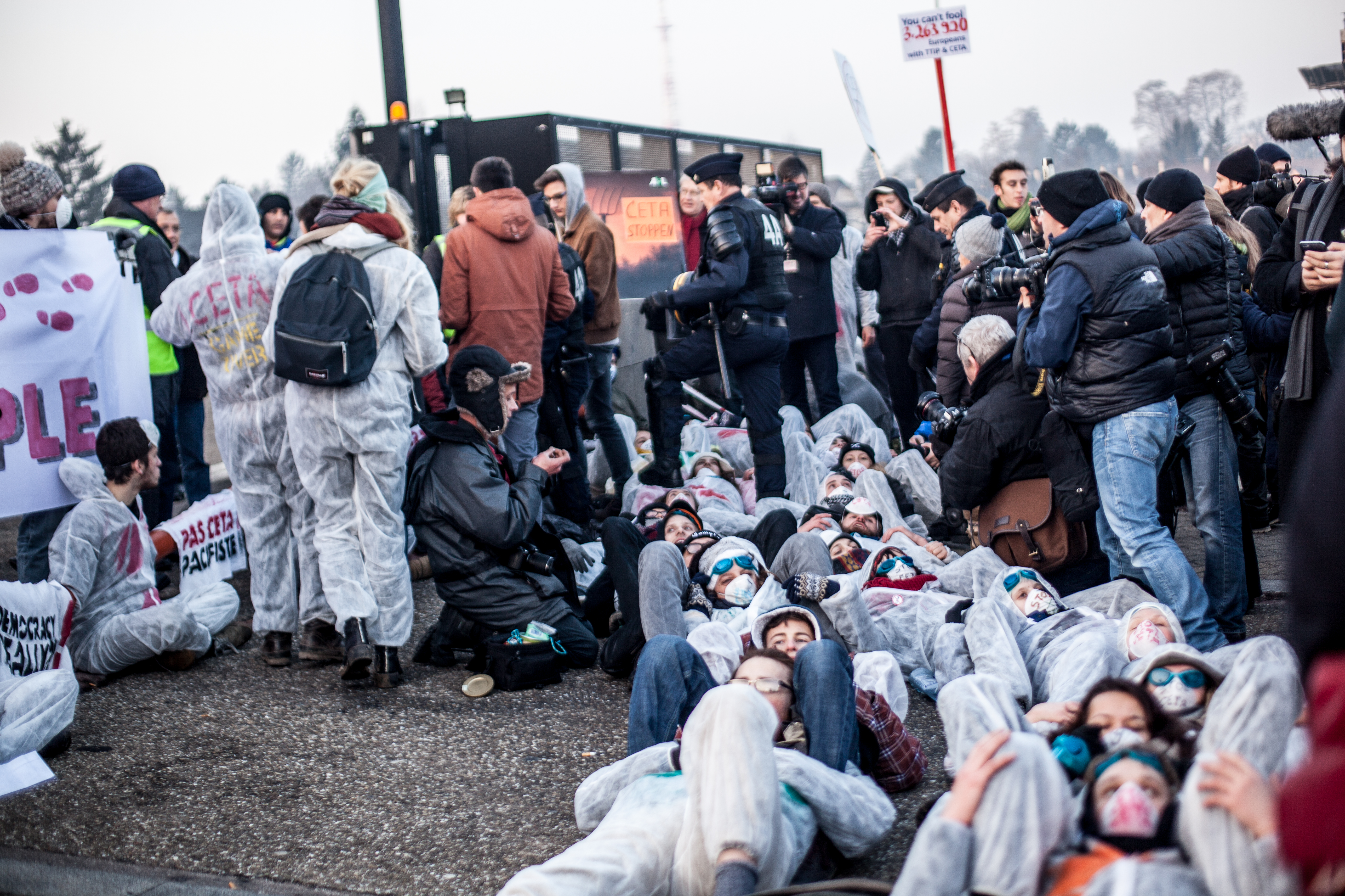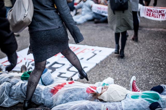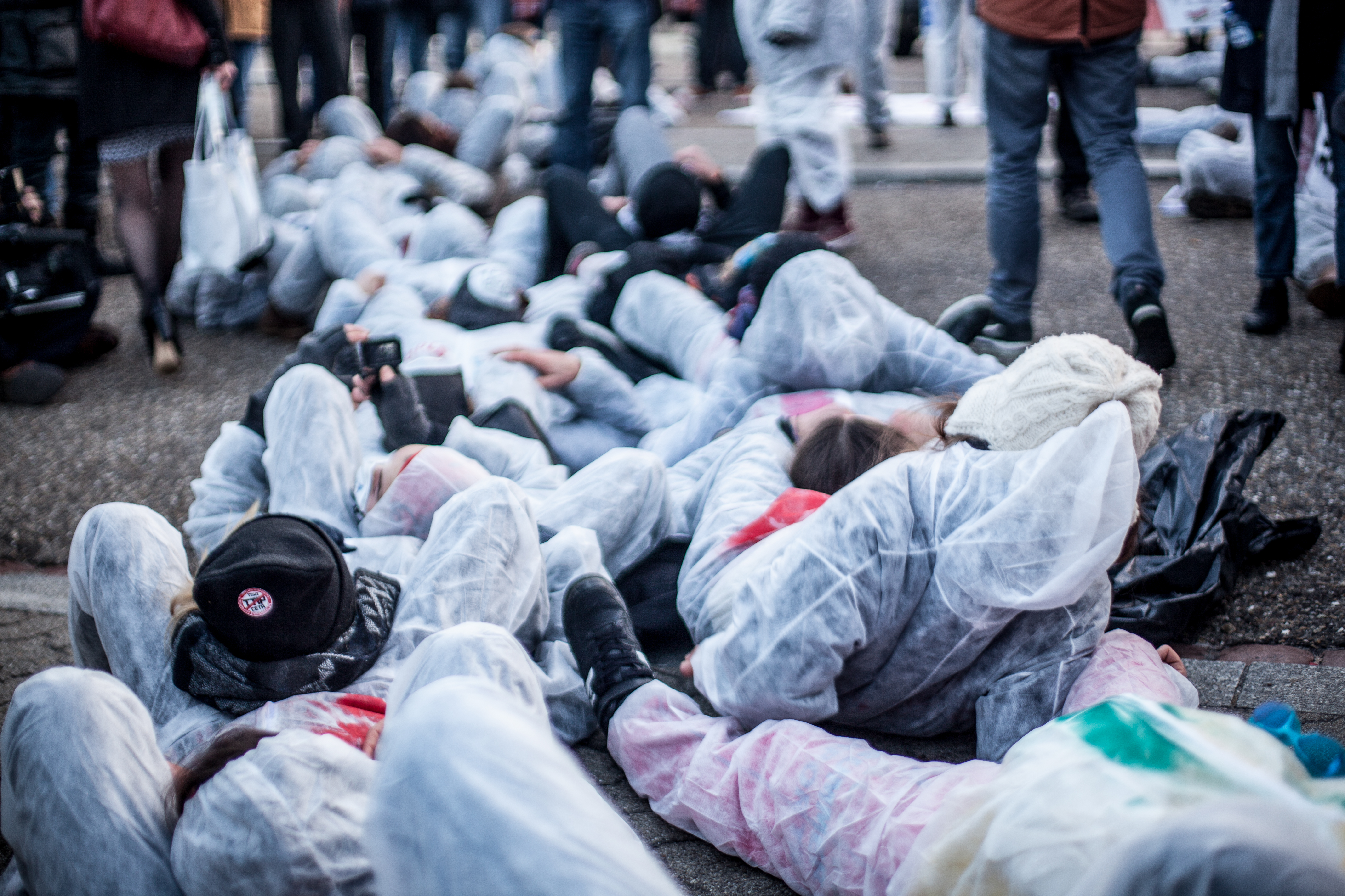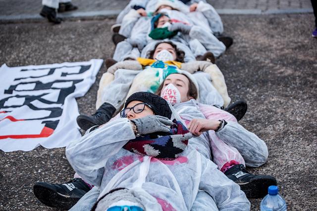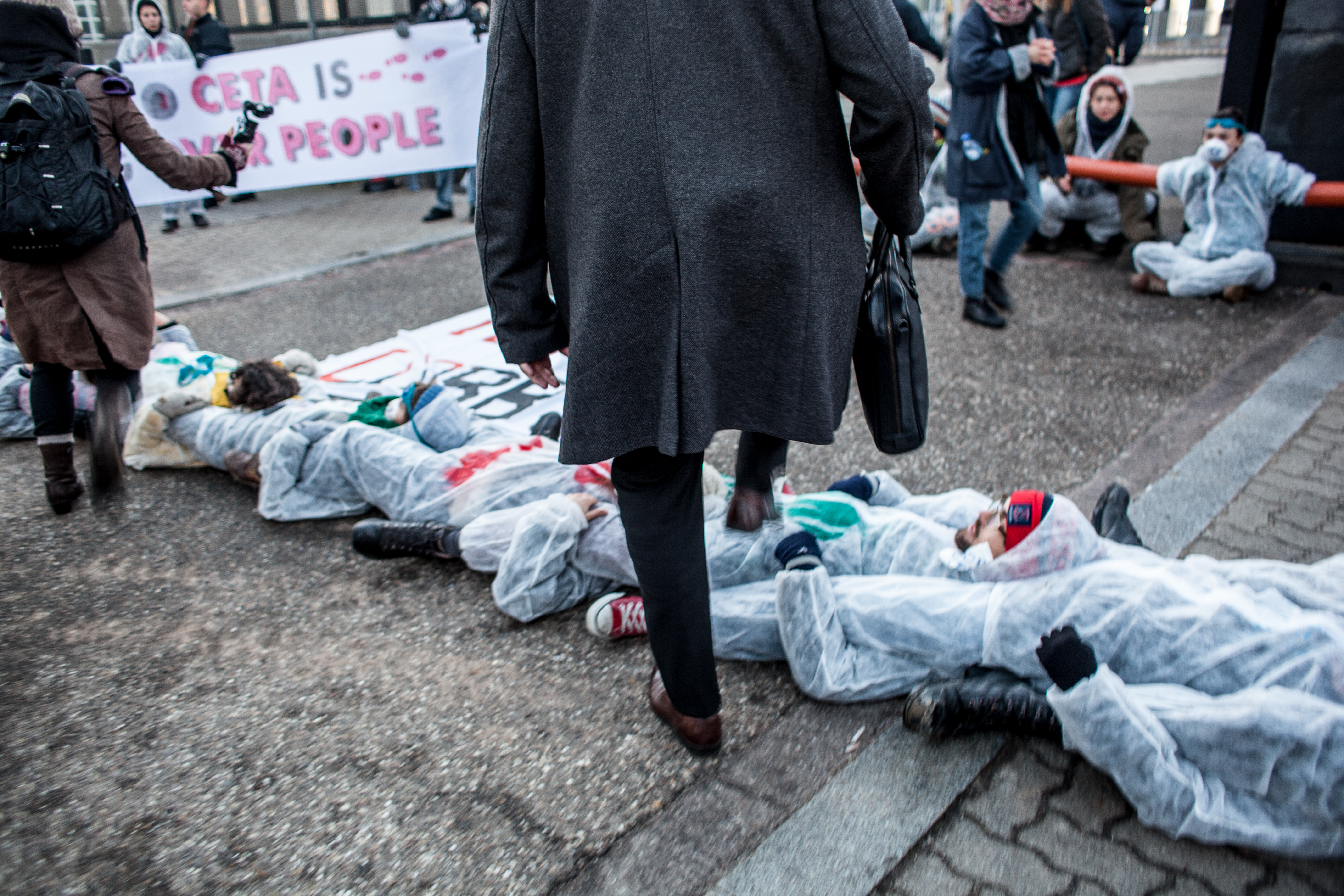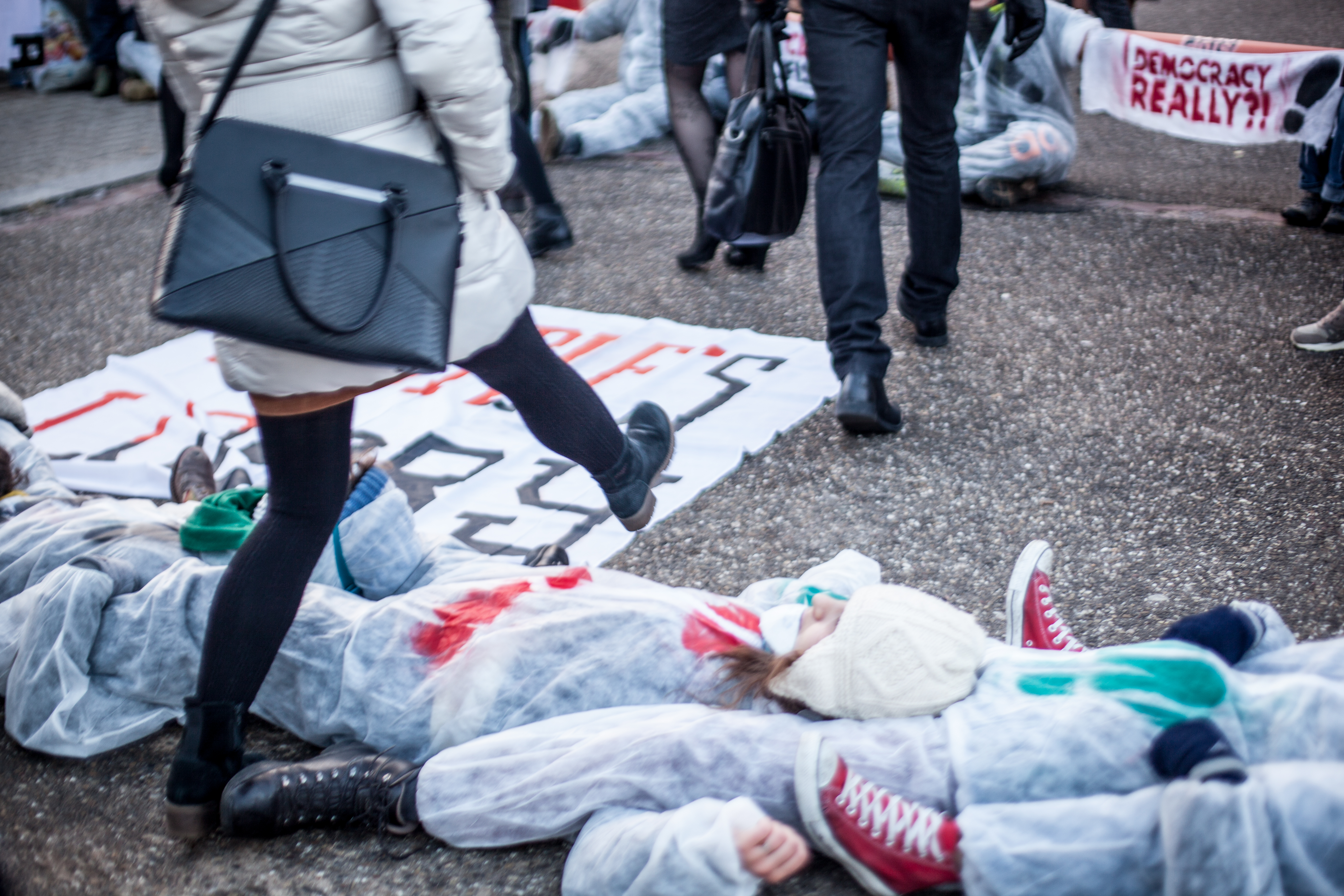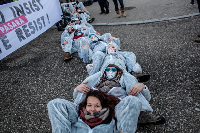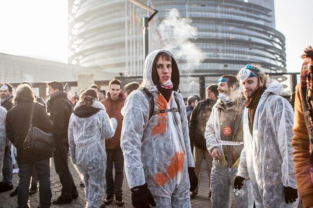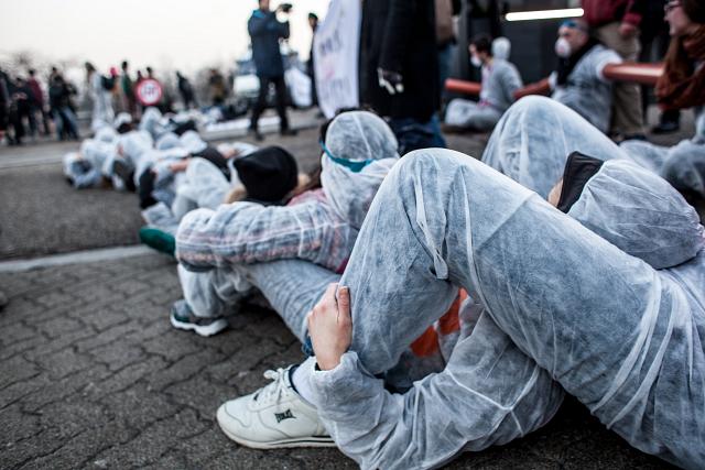 Le mercredi 15 février, dès 7h du matin, un groupe de 100 activistes se tenait à l’entrée du Parlement Européen, obligeant les parlementaires à les enjamber pour pouvoir accéder au site.