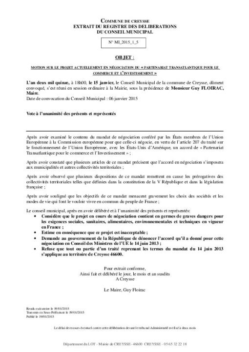 Creysse (46) Hors TAFTA mardi 20 septembre 2016 La Commune de Creysse se déclare Hors TAFTA Creysse (46) Hors TAFTA