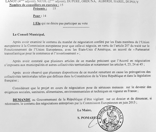 La commune d’HEUGAS dans les Landes ( 40) s’est déclaré « en vigilance » vis-à-vis du TAFTA.
