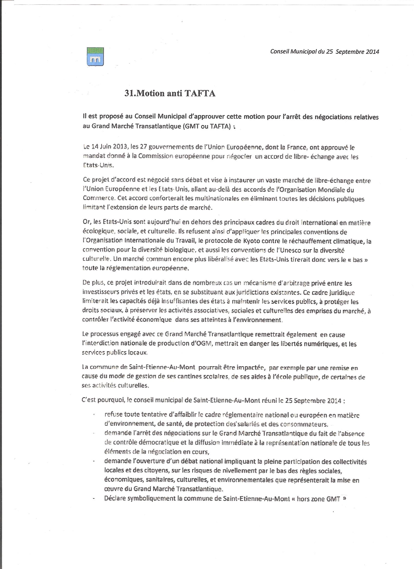 Saint-Etienne-Au-Mont (62360 Hors) TAFTA ! mercredi 1er octobre 2014 Le Conseil Municipal de la Commune de Saint-Etienne-Au-Mont 62360 a adopté une motion anti TAFTA le jeudi 25 septembre 2014 et déclare symboliquement la commune de Saint-Etienne-Au-Mont « hors zone GMT »... Lire la motion :