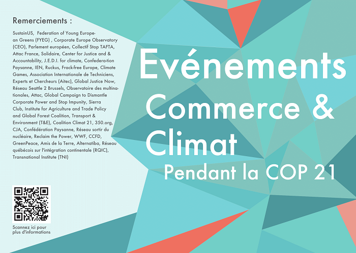 Nous, organisations française de la société françaises, syndicats, mouvements paysans, communautés, mouvements de citoyens, qui nous battons contre la politique commerciale de l’Union européenne, faisons appel à vous, nos alliés, nos camarades, partenaires... partout dans le monde, pour nous rejoindre dans les mobilisations qui se dérouleront autour de la Conférence Climat de Paris, en décembre prochain.