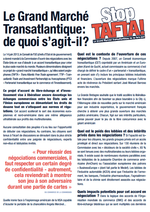 L’Union européenne et les États-Unis négocient depuis juillet 2013 un traité de libre-échange connu sous les sigles de TAFTA ou TTIP. Comme tous les traités de libre-échange, il a vocation à supprimer les protections douanières face aux importations de marchandises. Cela permettra dès lors de saturer les marchés européen et américain de produits et de services déjà disponibles localement, dans des conditions sanitaires, sociales ou environnementales dégradées.