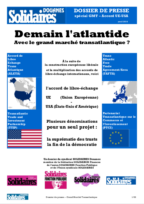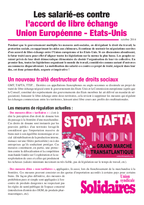TAFTA et droits sociaux jeudi 12 mars 2015 Droits sociaux Téléchargez le dossier (CGT, 16 pages) Téléchargez le 4 pages droits sociaux (Solidaires) Téléchargez la revue de presse (Solidaires Douanes, 32 pages)
