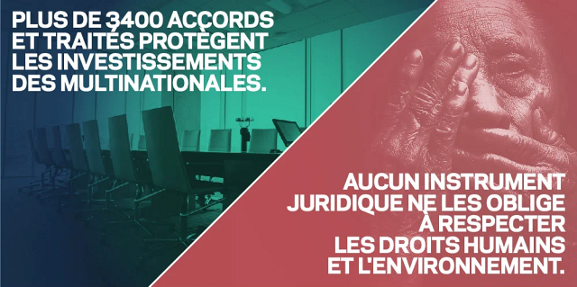 Pendant ce temps, les multinationales attaquent chaque État qui mettrait en place des règles qui pourraient nuire à « des attentes légitimes » de profits et gagnent grâce à ce système des milliards. C’est la réalité de l’arbitrage, ou Investor-State Dispute Settlement (ISDS) en anglais. Un système qui donne aux super-riches la possibilité d’attaquer n’importe quelle réglementation : de la législation de santé publique sur les paquets neutres de cigarettes aux montants des salaires minimums, ou même en France, d’introduire des moratoires sur la fracturation hydraulique et repousser de plusieurs dizaines d’années la transition énergétique alors que l’urgence est bien-là.