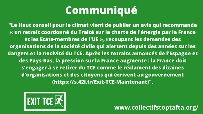 Le Haut conseil pour le climat vient de publier un avis sur la modernisation du Traité sur la Charte de l’Énergie (TCE) qui recommande notamment « un retrait coordonné du TCE par la France et les États-membres de l’UE ». Le collectif Stop CETA-Mercosur se félicite de la publication de cet avis et de ces recommandations qui recoupent très largement l’analyse et les demandes des organisations de la société civile qui alertent depuis des années sur les dangers et la nocivité du TCE. Après les retraits annoncés de l’Espagne et des Pays-Bas, la pression sur la France augmente : la France doit s’engager à se retirer du TCE comme le réclament des dizaines d’organisations et des citoyens qui écrivent au gouvernement (https://s.42l.fr/Exit-TCE-Maintenant)".