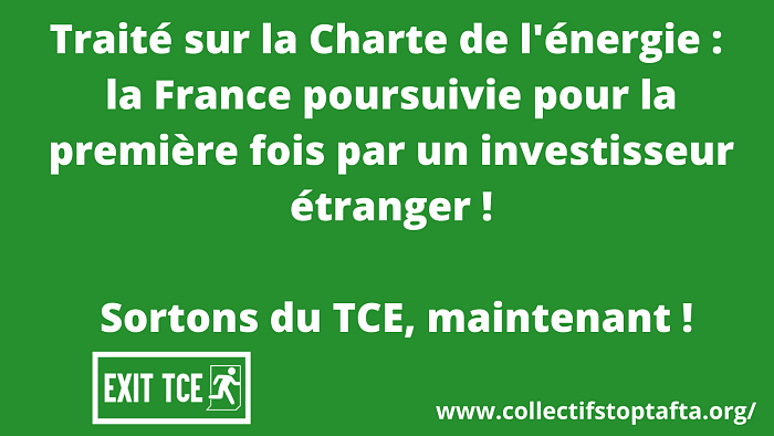 Depuis le 2 septembre, la France est officiellement poursuivie au titre du Traité sur la charte de l’énergie (TCE). C’est une première. L’investisseur allemand Encavis AG, et trois de ses filiales, dont deux françaises, ont en effet engagé une procédure d’arbitrage contre la France, suite à la révision à la baisse des tarifs d’achat de l’électricité photovoltaïque, décidée par le gouvernement français en 2020. Sans réaction à ce sujet, le gouvernement français ne s’est toujours pas prononcé sur l’avenir du TCE, traité nocif tant pour la transition énergétique que pour la capacité des pouvoirs publics de réguler finement le secteur. Le collectif Stop CETA-MERCOSUR rappelle son exigence, soutenu par un millions de signataires en Europe : Sortons du TCE, maintenant !