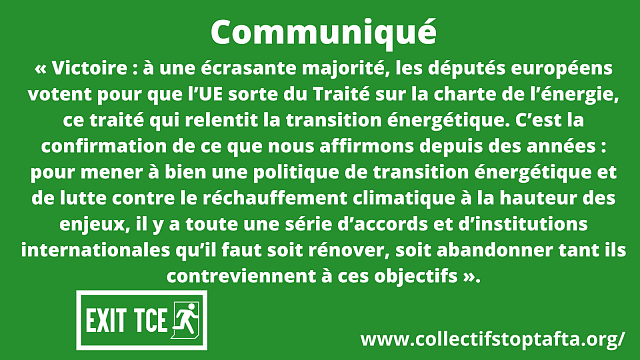 - 24 nov. 2022 : VICTOIRE - Le Parlement UE appelle la Commission à un retrait conjoint de l’UE du Traité sur la charte de l’énergie