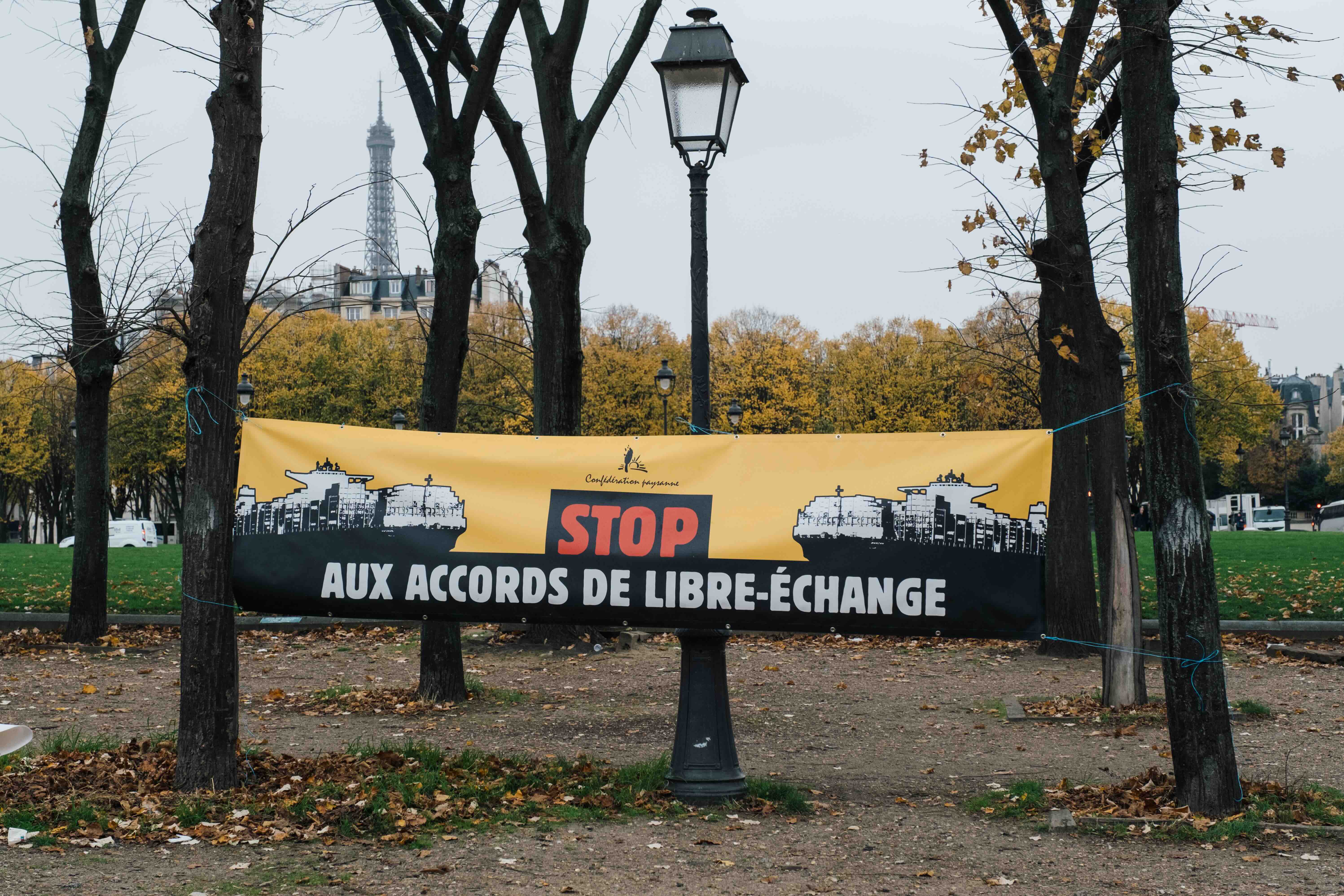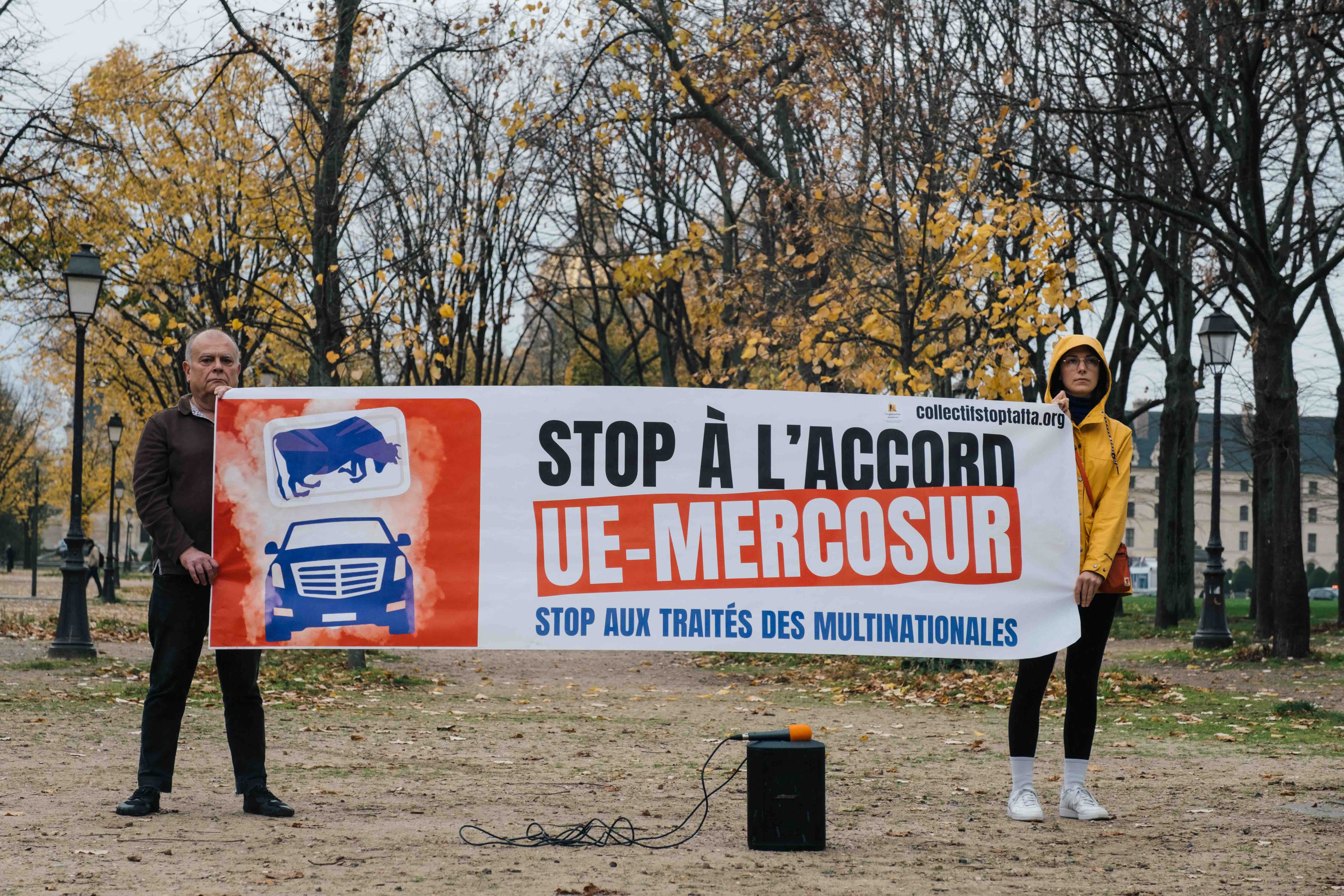 Alors que le sommet des chefs d’État en prélude à la COP30 sur le réchauffement climatique débute au Brésil en présence d’E. Macron et que le processus de ratification de l’accord UE-Mercosur a été enclenché, les organisations de la société civile réunies au sein du collectif national Stop Mercosur avaient donné rendez-vous ce jeudi 16 novembre à 12h sur l’esplanade des Invalides à Paris pour passer au crible les réponses d’Emmanuel Macron et appeler l’exécutif à s’opposer à la ratification de cet accord nocif comme le réclament 46 organisations de la société civile.