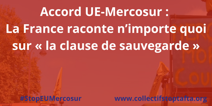 - il faudrait aujourd’hui l’approbation des pays du Mercosur sur le contenu de la la proposition de règlement de la Commission européenne sur les modalités d’application de la clause de sauvegarde : c’est faux puisque c’est un texte législatif unilatéral qui ne précise que les modalités de mobilisation de cette clause de sauvegarde côté européen ; depuis quand faudrait-il faire que l’approbation d’une législation interne à l’UE dépende d’une approbation extérieure à l’UE ?