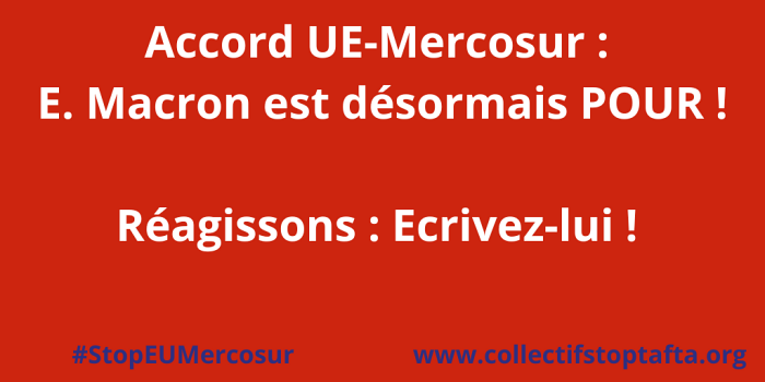 Ne laissons pas Emmanuel Macron ratifier l’accord de libre-échange entre l’Union européenne et les pays du Mercosur (Brésil, Argentine, Uruguay, Paraguay) sans réagir. Il est urgent de se mobiliser : E. Macron est en effet subitement passé d’un « Non en l’état » à un « Oui probablement », acceptant de facto ce qu’il disait inacceptable il y a encore peu.