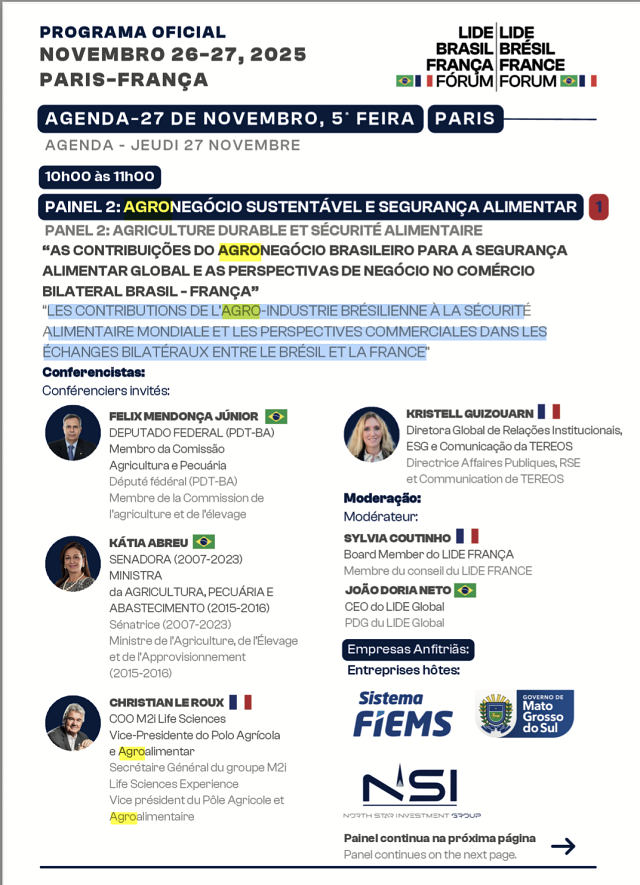 Ce même 27 novembre, l’Elysée et le Ministère des affaires étrangères recevaient pourtant en catimini - ce n’était initialement pas à l’agenda public d’E. Macron - des acteurs économiques et politiques brésiliens de premier plan favorable à l’accord UE-Mercosur, à l’occasion à l’occasion du Forum LIDE France-Brésil, un forum d’affaires fondé par l’ancien gouverneur de São Paulo, João Dória. Parmi les présents :