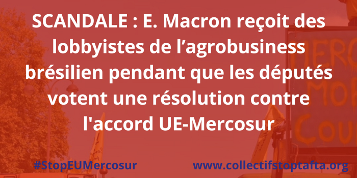 Le jour-même où une très large majorité des députés votaient à l’Assemblée nationale une résolution lui demandant de bloquer l’accord UE-Mercosur, Emmanuel Macron recevait des acteurs économiques et politiques brésiliens de premier plan favorables à l’accord UE-Mercosur, dont des représentants de JBS, plus grand éleveur de bétail au monde. Pour le collectif national Stop Mercosur, c’est un nouvel exemple du double jeu du Président de la République : dire qu’il n’est pas (encore) satisfait de l’accord, tout en rassurant les milieux économiques derrière portes closes sur le fait que cet accord nocif verra bien le jour. Pour le collectif national Stop Mercosur, le message provenant de l’opinion publique, de la société civile et des assemblées est pourtant très clair : la France avait le pouvoir de stopper cet accord (avec d’autres) — elle a désormais le devoir moral et politique de le faire.