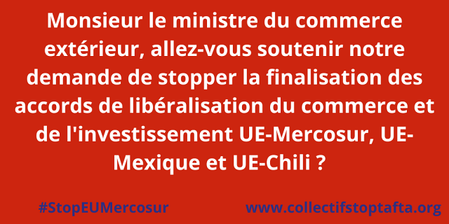- Pour une alternative à l’accord de libéralisation du commerce UE-Mercosur : A relayer ici sur twitter, ici sur Facebook, ici sur Youtube