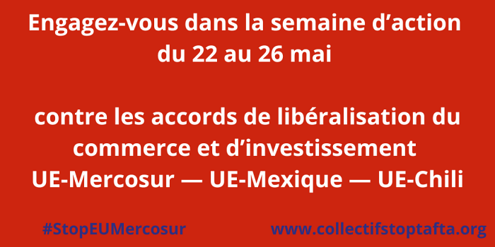 A l’occasion de la réunion des ministres du commerce des États membres de l’UE du jeudi 25 mai, les organisations de la société civile européenne, dont le collectif Stop CETA-Mercosur, ont appelé à une semaine d’actions pour s’opposer aux accords de libéralisation du commerce et d’investissement UE-Mercosur, UE-Chili et UE-Mexique. L’ensemble des organisations de la société civile, les collectifs locaux ainsi que les simples citoyennes et citoyens sont invités à s’engager et participer pleinement à cette semaine d’actions selon les modalités suivantes. Merci de nous tenir informés des initiatives que vous prendrez en écrivant à contact@collectifstopTAFTA.org.