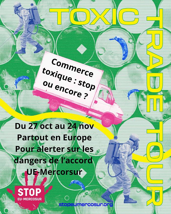 Ce lundi 27 octobre débute le Toxic tour européen contre l’accord de libre-échange UE-MErcosur. Pendant un mois, de Vienne à Bruxelles, en passant par de nombreuses capitales européennes, une camionnette chargée de barils de pesticides hautement toxiques va parcourir jusqu’au 24 novembre, date de la réunion du Conseil « Commerce » de l’UE à Bruxelles. Des actions et des manifestations auront lieu dans au moins 11 villes européennes pour protester contre la ratification de l’accord de libre-échange UE-Mercosur.