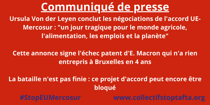 Ce vendredi 6 décembre, la Présidente de la Commission européenne a annoncé avoir conclu les négociations de l’accord de libre-échange UE-Mercosur, le plus nocif jamais négocié ces dernières années. Pour le collectif national Stop Mercosur c’est un jour tragique pour le monde agricole, l’alimentation, les emplois et la planète. Cette annonce signe l’échec patent de la stratégie d’Emmanuel Macron qui n’a rien entrepris à Bruxelles depuis 4 ans pour empêcher ces négociations d’être conclues. Cet accord « viande contre voitures », négocié par la Commission européenne derrière portes closes et sans tenir compte du rejet grandissant qu’il génère, pensé pour satisfaire l’appétit des entreprises multinationales et non les besoins des populations, ne doit pas voir le jour. La bataille n’est pas finie : ce projet d’accord peut encore être bloqué en amont de sa présentation au Conseil, lors de cette éventuelle présentation, puis au Parlement européen. Nous, organisations de la société civile opposées à cet accord, en lien avec nos partenaires européens et d’Amérique du Sud, nous nous y emploierons de toutes nos forces.