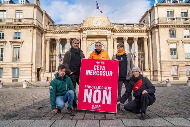 Par ailleurs, le résultat du vote oblige le gouvernement français à mettre un autre accord de libre échange au débat : le CETA, accord commercial avec le Canada, est également un accord commercial néfaste pour l’agriculture et l’alimentation, la lutte contre le changement climatique, mais aussi les droits sociaux. Le CETA et l’accord UE-Mercosur suivent une même logique mortifère, conjointement dénoncée par les plus de 150 000 signataires de la pétition que le collectif Stop CETA-Mercosur a symboliquement remis ce mardi 26 novembre. Contrairement à l’accord UE-Mercosur, le CETA a déjà été signé par la Commission européenne et approuvé par le Conseil européen, qui a validé son entrée en vigueur provisoire. Il appartient depuis 7 ans aux parlements nationaux de se prononcer sur sa ratification : un vote de l’Assemblée nationale dans les prochaines semaines aurait cette fois une conséquence directe sur la procédure de ratification, et si l’Assemblée venait à le rejeter, cet accord devrait en toute logique être abandonné.