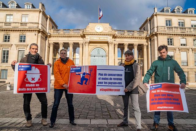En prélude aux votes symboliques et non contraignants à l’Assemblée nationale et au Sénat sur l’accord UE-Mercosur, nous nous sommes rendus devant l’Assemblée nationale pour remettre symboliquement une pétition endossée par 150 000 personnes demandant l’abandon de l’accord UE-Mercosur et du CETA.