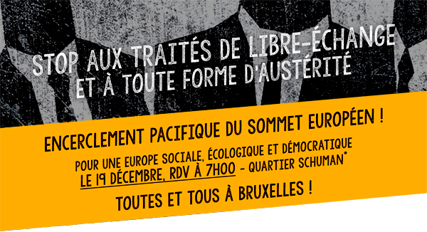 Le 19 décembre, la coalition D19-20 d’organisations belges (http://www.d19-20.be/) prépare un encerclement du Conseil de l’Union européenne. Cette proposition d’action fait suite à deux initiatives de ce type qui ont eu lieu l’année dernière à la même époque et au même endroit, puis au printemps lors de l’encerclement du European Business Summit, sommet du patronat européen. Dans les deux cas, les objectifs étaient la dénonciation des politiques d’austérité et des accords de libre-échange (TAFTA, CETA, TiSA) négociés par l’UE avec notamment les États-Unis et le Canada, en mettant en lumière l’absence de démocratie qui entourent ces politiques.