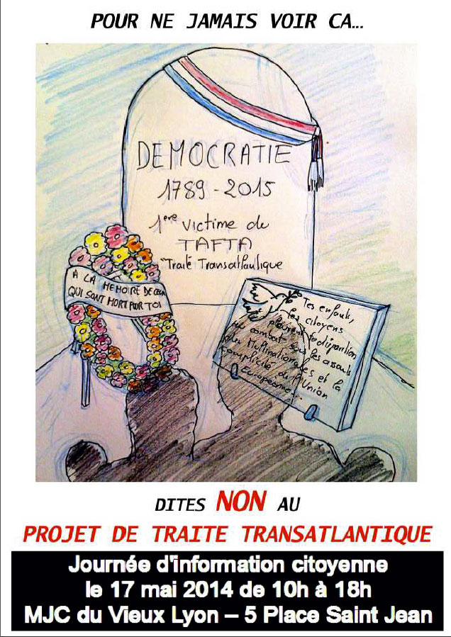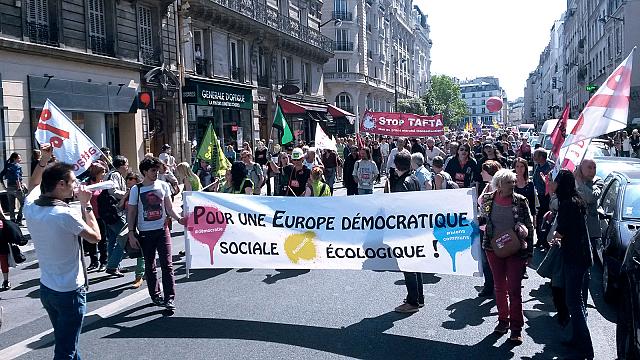 17 mai : journée européenne de mobilisation contre le grand marché transatlantique (TAFTA), pour des alternatives à l’austérité Plus de 30 organisations appellent à manifester à Paris le samedi 17 mai à partir de 14h de la place de l’Opéra à la place de la République, où se tiendra un « village des alternatives ».