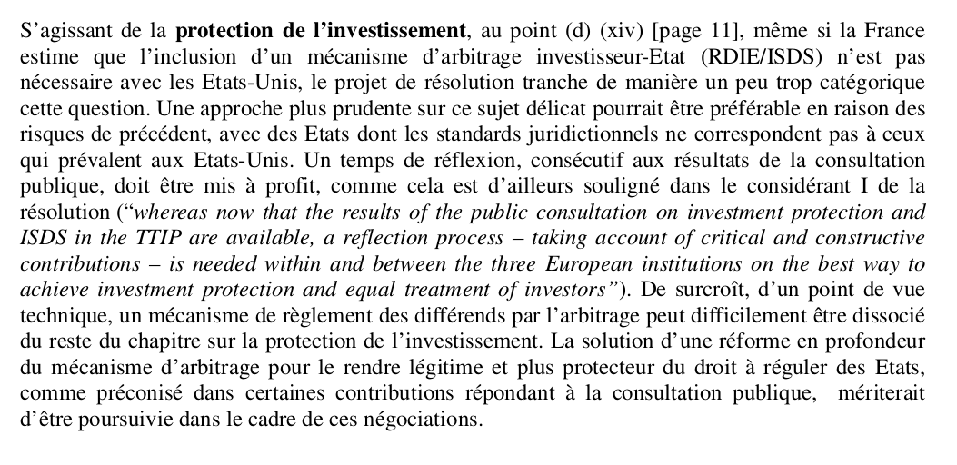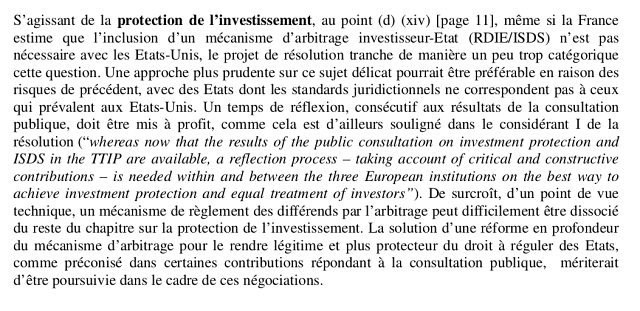 La note communiquée ce mardi aux eurodéputés français confirme ces manœuvres : alors que la résolution étudiée par le Parlement Européen penche en faveur d’un rejet du mécanisme, les autorités françaises conseillent aux parlementaires d’"adopter une approche plus prudente sur ce sujet délicat". En d’autres termes, le gouvernement demande aux parlementaires d’affaiblir la position, déjà bien timide, du rapporteur social démocrate allemand Bernd Lange.