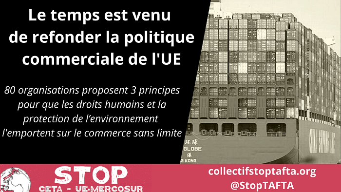 La pandémie de Covid-19 a mis en lumière les dangers que génèrent la mondialisation néolibérale et productiviste sur nos système de santé et notre avenir. Plus de 80 organisations de la société civile européenne, parmi lesquelles, en France, le collectif national Stop CETA/Mercosur, l’Aitec, les Amis de la Terre, Attac France, le CADTM, le CCFD-Terre Solidaire, la Confédération paysanne, la Fédération Artisans du Monde, France Nature Environnement, Sherpa et l’Union syndicale Solidaires, etc sont signataires d’une prise de position qui explicite trois des principes autour desquels la politique commerciale européenne doit être refondée : 1) Stopper le cours actuel de l’organisation du commerce et des investissements ; 2) Mettre fin aux privilèges des multinationales et à leur impunité ; 3) Favoriser la coopération et la relocalisation écologique et sociale au lieu de la compétition et la mondialisation néolibérales. Chacun de ces principes est explicité par plusieurs propositions qui montrent combien une autre politique commerciale est possible. Cette contribution a été soumise à la Commission européenne, dans le cadre de la consultation publique et de l’examen de sa propre orientation en matière de commerce qu’elle a organisée cette année : la Commission doit présenter une communication sur le résultat de cette consultation d’ici à la fin de l’année. Cette contribution de la société civile (également disponible ici en pdf et dans plusieurs autres langues plus bas) a également été transmise au gouvernement et aux parlementaires français.