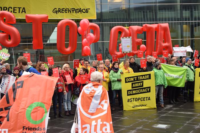 Malgré l’échéance du 27 octobre, date du Sommet UE-Canada où était prévue la signature formelle du traité, le gouvernement wallon se refuse à des décisions hâtives. Soucieux de l’avis des parlementaires wallons, qui ont entendu les craintes de leurs citoyens, il exige de rouvrir le texte, afin d’y introduire des protections supérieures pour les filières agricoles et industrielles sensibles ou dans le domaine des droits sociaux et environnementaux.
