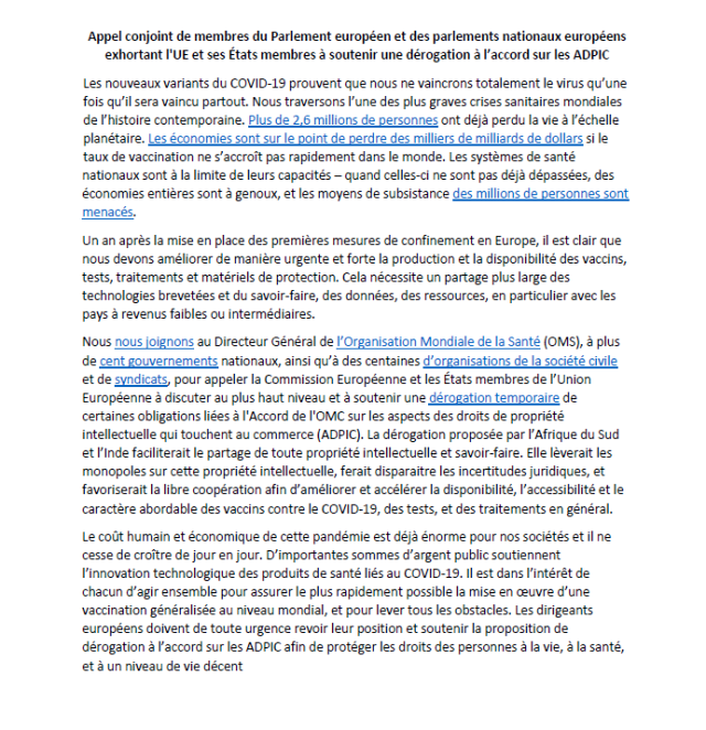 INFO PRESSE : Plus de 275 parlementaires en Europe appellent Bruxelles et les États-membres à accepter de lever les brevets sur les vaccins