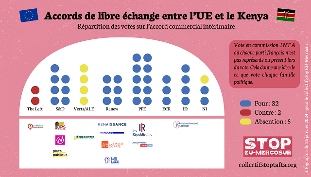 Pour Maxime Combes, économiste à l’Aitec, « En pleine crise agricole, et après l’accord UE-Nouvelle-Zélande en décembre, une majorité de députés européens ont voté en faveur des accords de libéralisation du commerce avec le Chili et le Kenya UE-Chili & UE-Kenya qui vont accroître les importations de produits agricoles en Europe venant de l’autre bout de la planète, et sans garantie qu’ils soient alignés sur la législation qui encadre la production de produits agricoles en UE. C’est un mauvais coup pour le monde agricole et notre avenir commun ».
