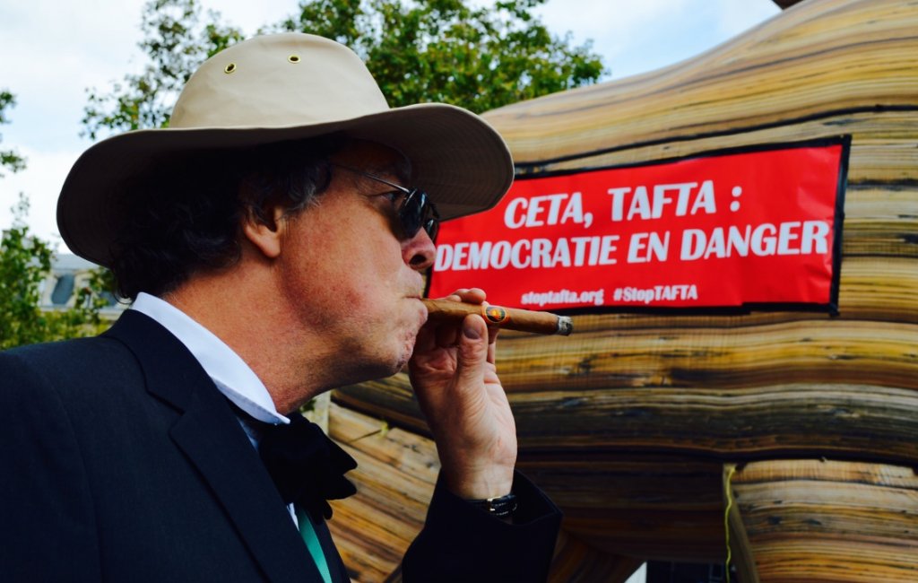 Cette action a mis en scène un cheval de Troie gonflable géant, symbolisant l’impunité des multinationales et de leurs lobbies en imposant leurs politiques et régulations ultra-libérales via les traités de libre-échange face aux citoyens révoltés venus crier leur droit à la démocratie.
