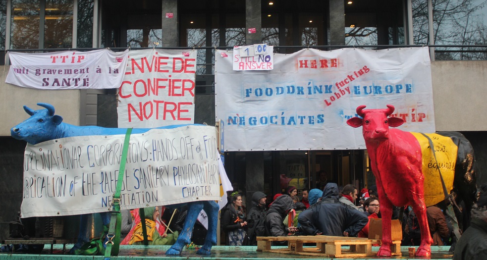 Une partie de ces organisations et citoyens a occupé ce matin le bâtiment de l’organisation Business Europe, un des principaux lobbies pro-TAFTA en Europe. Un second groupe s’était installé dans les locaux de FoodDrink Europe, le lobby européen de l’industrie agro-alimentaire, exigeant notamment la publication par la Commission Européenne des chapitres Agriculture et Produits sanitaires et phytosanitaires en l’état actuel du projet d’accord transatlantique. Tous ont réclamé l’arrêt des négociations.