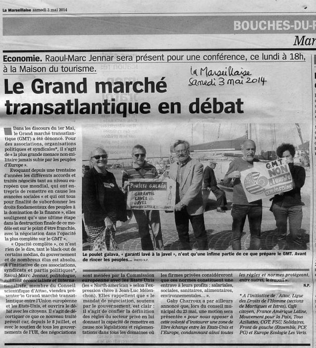 13 - Collectif STOP TAFTA-GMT MARSEILLE 13 Les Amis de la Terre, Attac Marseille, association Filière Paysanne, le Comité pour l’Annulation de la Dette du Tiers Monde (CADTM 13), la Confédération paysanne 13, Ensemble, Europe Ecologie Les Verts, la FSU, la Gauche anticapitaliste, les Jeunes écologistes (Aix Marseille Métropole), le Mouvement de la paix (13), le Parti de Gauche, Le PCF 13, le Réseau Environnement Santé (antenne Marseille), Solidaires, l’association Eau Bien Commun Paca, le Centre Culturel de Luminy (CCL), le Collectif Vigilance Gaz de Gardanne-Pays d’Aix,le Collectif Sud contre les Gaz de houille schiste, le Collectif Des Terres Fertiles (CDTF 13), Nouvelle Donne, Attac la Ciotat