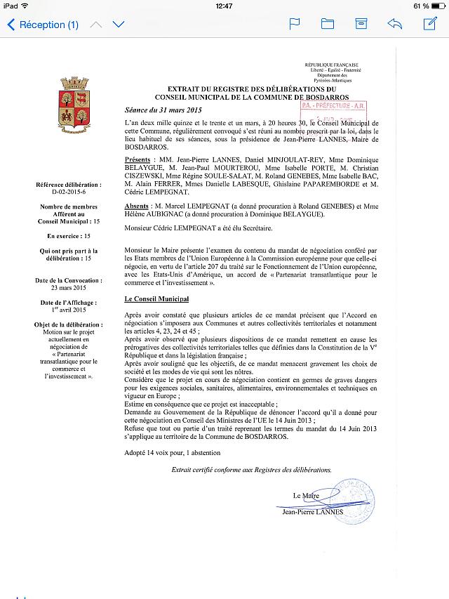 Bosdarros (64) Hors TAFTA mardi 22 septembre 2015 Le Conseil Municipal de la commune de BOSDARROS (64290) a voté le 31 mars 2015 une motion déclarant la commune hors TAFTA. Lire le délibéré : pièce jointe Bosdarros (64) Hors TAFTA