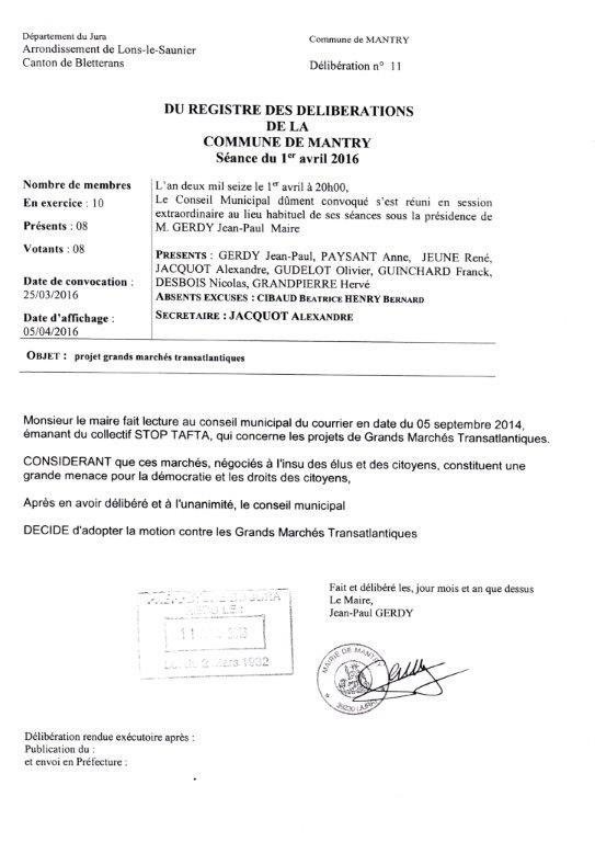 Le 1er avril 2016, la commune de Mantry a adopté une motion contre les grands marchés transatlantiques.
