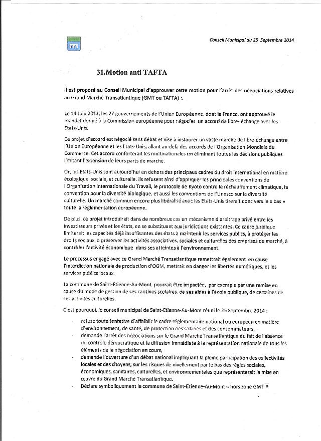 Saint-Etienne-Au-Mont (62360 Hors) TAFTA ! mercredi 1er octobre 2014 Le Conseil Municipal de la Commune de Saint-Etienne-Au-Mont 62360 a adopté une motion anti TAFTA le jeudi 25 septembre 2014 et déclare symboliquement la commune de Saint-Etienne-Au-Mont « hors zone GMT »... Lire la motion :