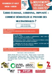 Journée de travail à l’Université des mouvements sociaux ce 27 août, co-organisée par l’Aitec, Fossil Free Politics, les Amis de la Terre, Attac France, Peuples Solidaires Action Aid, ReAct, Survie et le collectif Stop CETA-Mercosur.