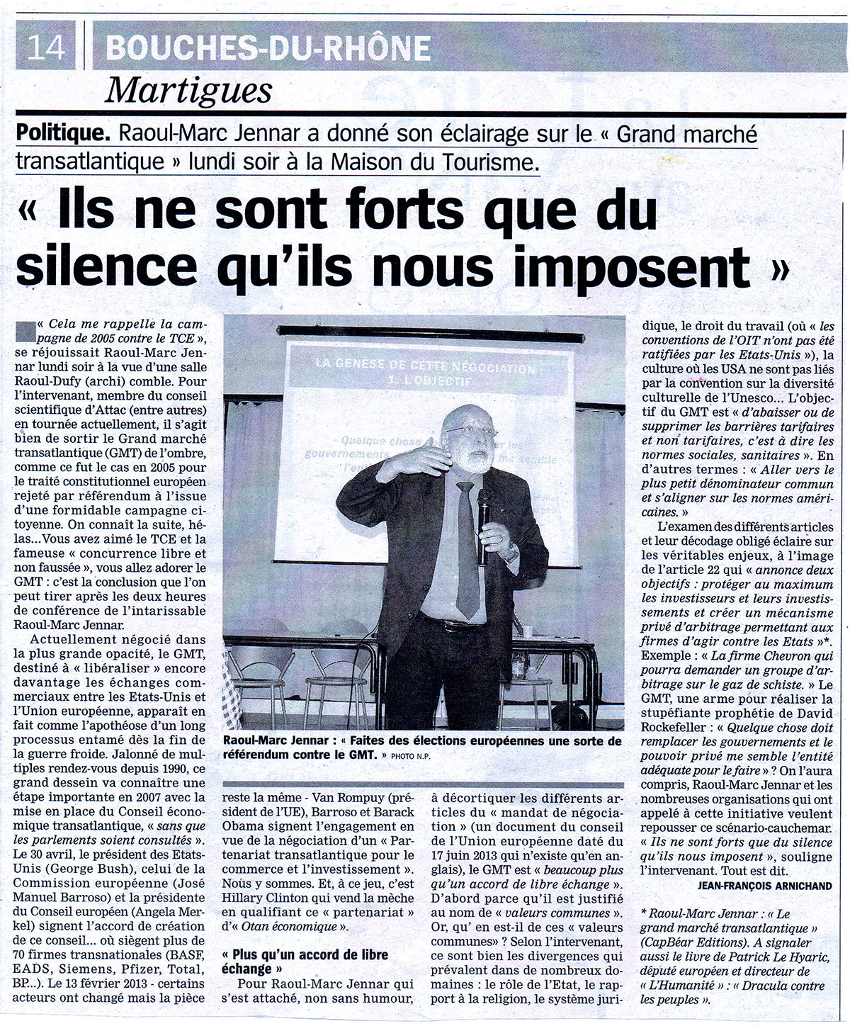 13 - Collectif StopTAFTA Aix en Provence- Gardanne – Salon de Provence Attac Aix, Attac Gardanne, Artisans du monde Aix, CADTM, Collectif aixois pour l’égalité, Confédération paysanne, Collectif vigilance Gaz de Gardanne-Pays d’Aix, Ensemble Aix, LDH Aix, PCF Aix, PG Aix, Front de Gauche Aix, Partit Occitan, Résister aujourd’hui, NPA, Jeunes Ecologistes Aix-Marseille + citoyens, Nouvelle donne, Mouvement des jeunes socialistes 13 et salon en transition